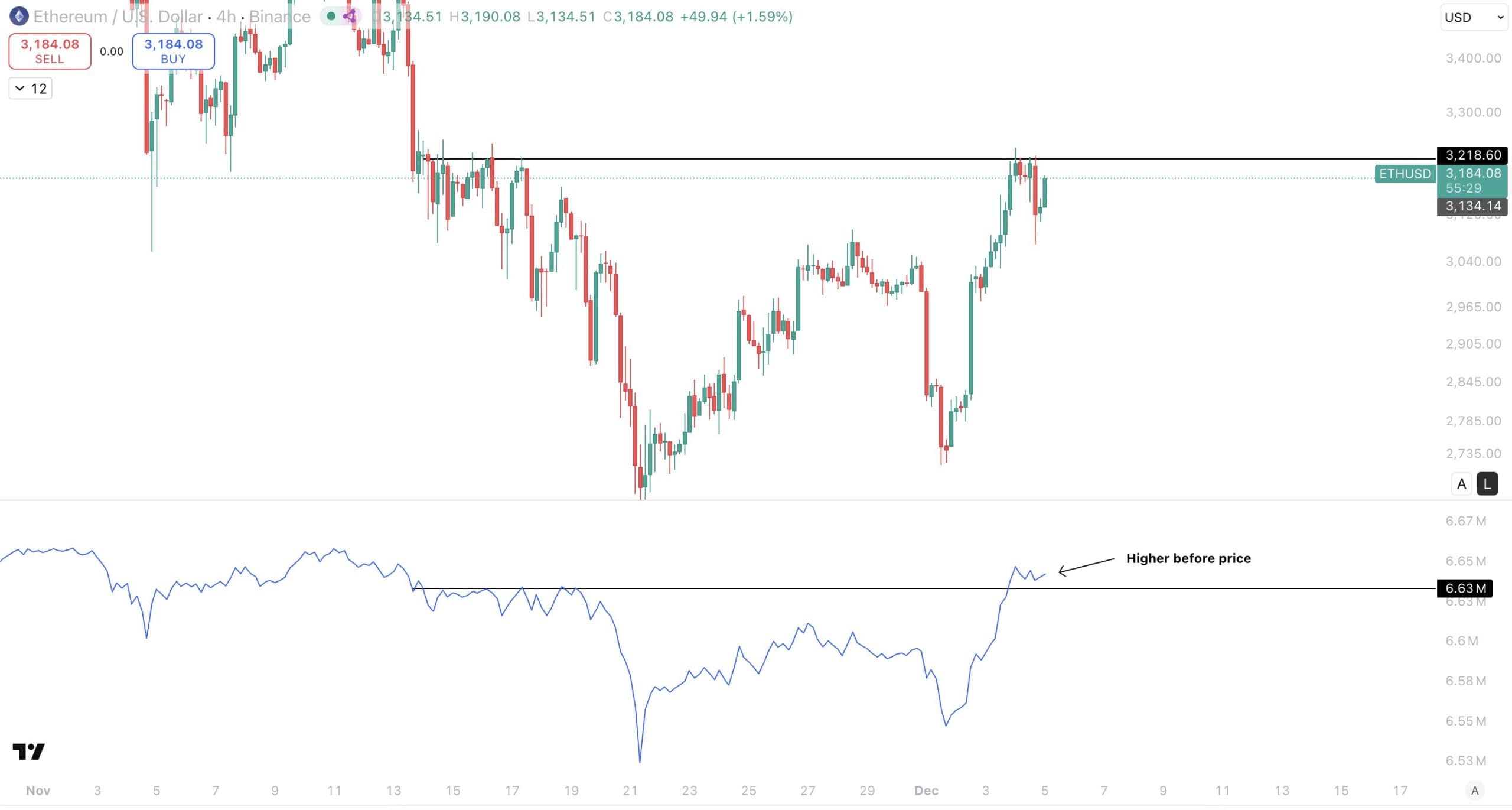 De analist laat zien dat de indicator On-Balance Volume (OBV) door een weerstandsniveau is gebroken. Dit is een indicator die koop- en verkoopdruk meet door handelsvolume en prijsbewegingen te vergelijken.