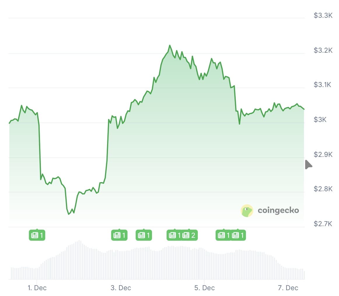 Vooralsnog is hier echter weinig van te merken en is ethereum vooral aan het schommelen. Op het moment van schrijven is de munt 3.037 dollar waard.