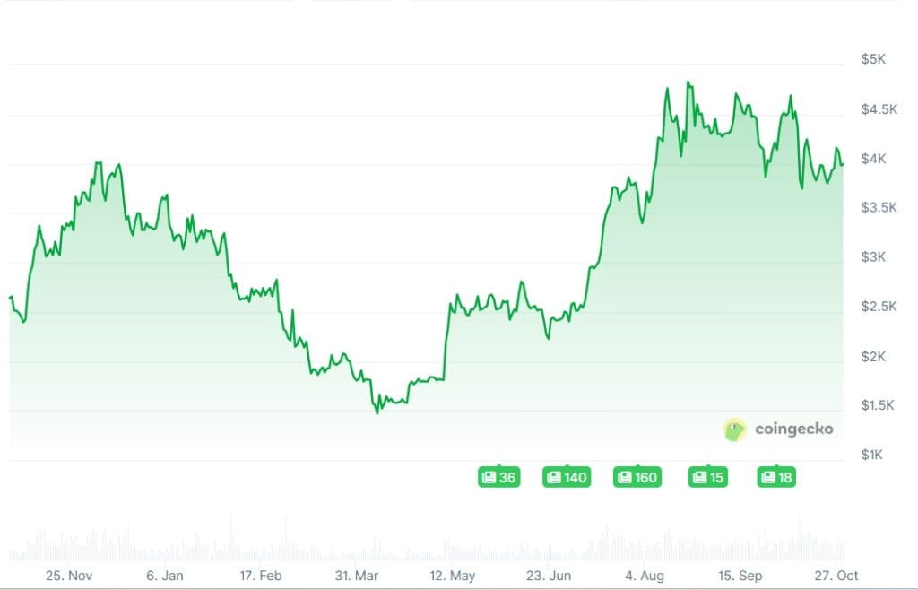 De eigenaar van deze wallet zag al zeer vroeg de potentie van ethereum. In 2014 nam deze belegger deel aan de eerste ICO van de cryptomunt en betaalde 6200 dollar voor 20.000 ETH. Ethereum wist aan het prille begin 60 miljoen tokens te verkopen tegen een gemiddelde prijs van 0,31 dollar per stuk. Een wereld van verschil met de huidige ETH-koers van 3996.94 dollar.