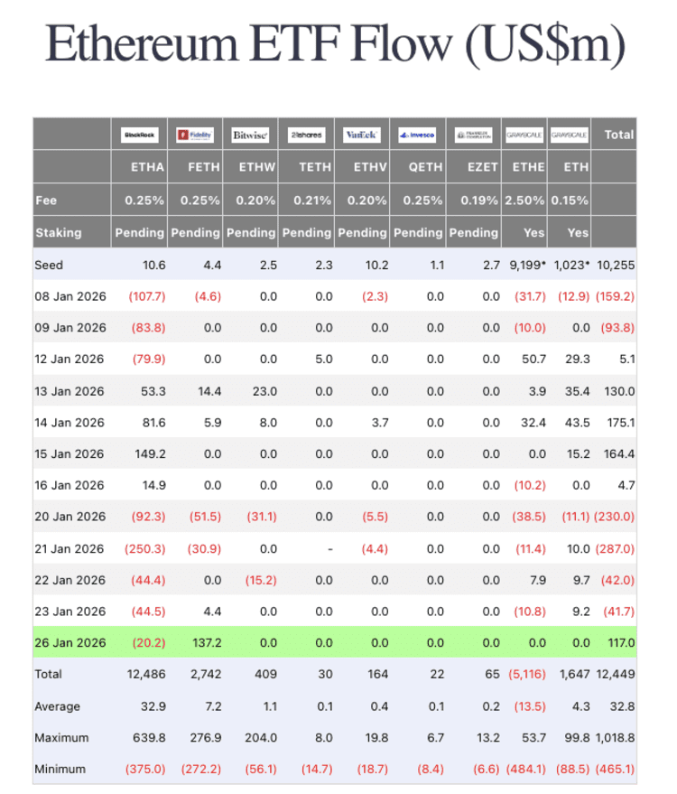 Rond ethereum gebeurt iets opvallends. De Amerikaanse beursfondsen zagen gisteren eindelijk weer een forse instroom na een moeilijke periode. Dat viel direct samen met een lichte koersstijging