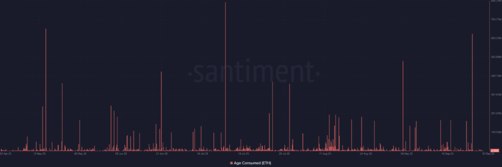 De afgelopen maanden zijn langetermijn-investeerders van ethereum actiever geworden, blijkt uit data van blockchainanalyse-bedrijf Santiment. Volgens de indicator Token Age Consumed werden in september een aanzienlijk aantal ethereum munten verplaatst die stammen uit de beginperiode, toen ze werden verkocht via een Initial Coin Offering (ICO).