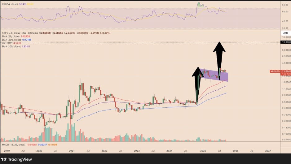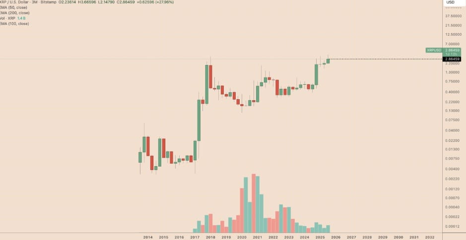 Gaat de geschiedenis zich herhalen? De huidige XRP-koers van 2,86 dollar ligt 20 procent onder de all-time high van 3,65 dollar. De cryptomunt bereikte dit hoogtepunt niet in 2017, maar op 18 juli 2025.