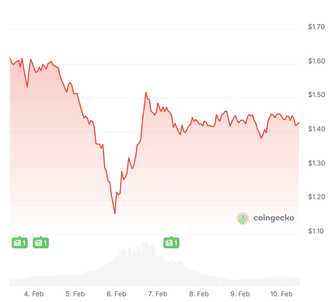 Op het moment van schrijven is XRP 1,43 dollar waard, na een onstuimige week met zowel sterke prijsdaling als -stijging. Vorige week daalde de koers in eerste instantie met ongeveer 33 procent, maar op vrijdag 6 februari herstelde de koers gedeeltelijk met een stijging van 30 procent.