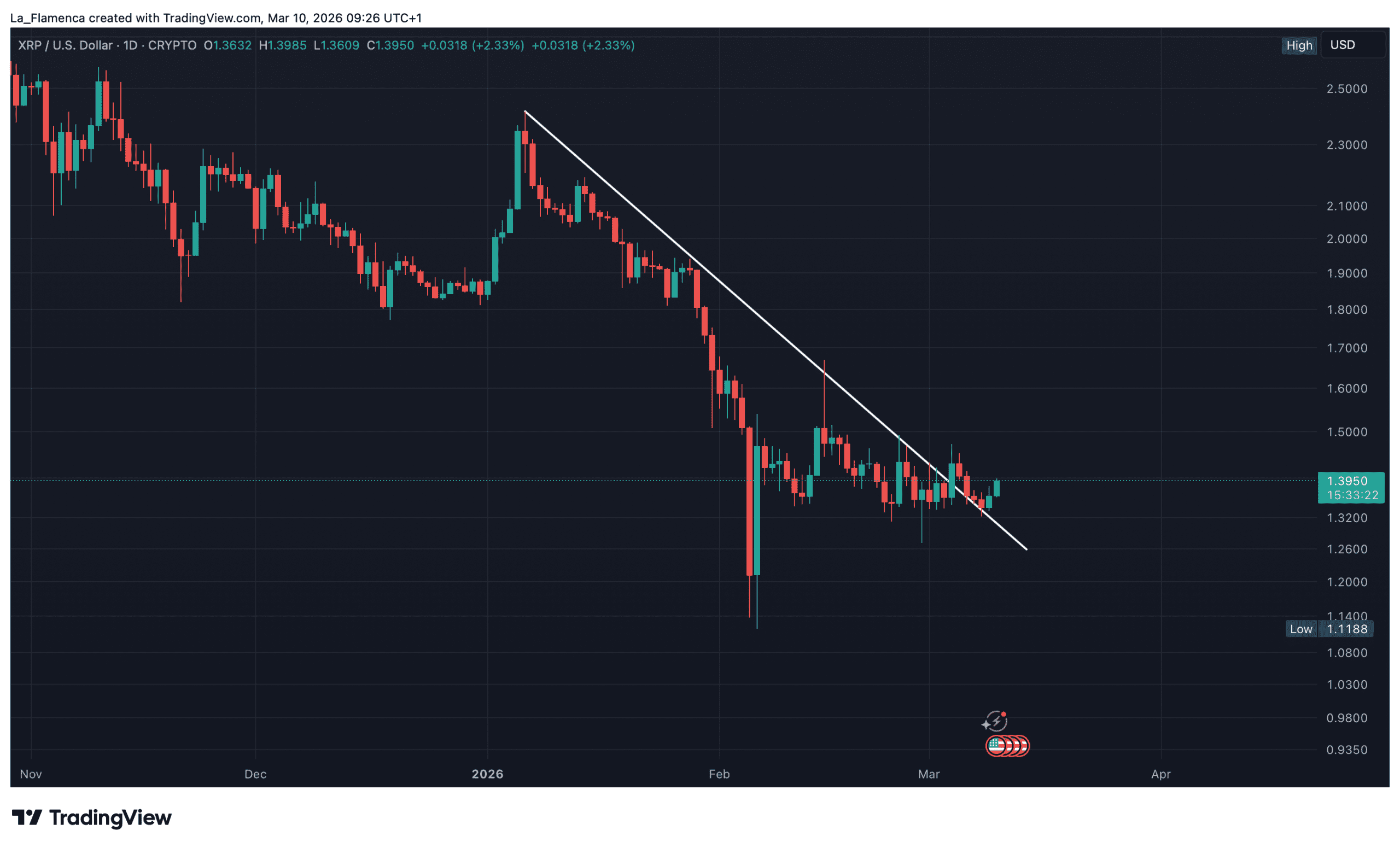 Met deze recente stijging lijkt XRP nu een belangrijke uitbraak te maken. Sinds begin dit jaar heeft zich een neerwaartse trendlijn gevormd in de dagelijkse koersgrafiek, maar vorige week is XRP hier bovenuit gebroken.