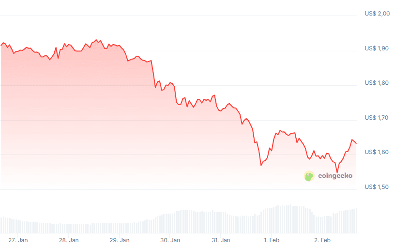Op het moment van schrijven is XRP 1,63 dollar waard. De laatste keer dat de koers zich voor langere tijd rond deze prijs bevond, was in november 2024.