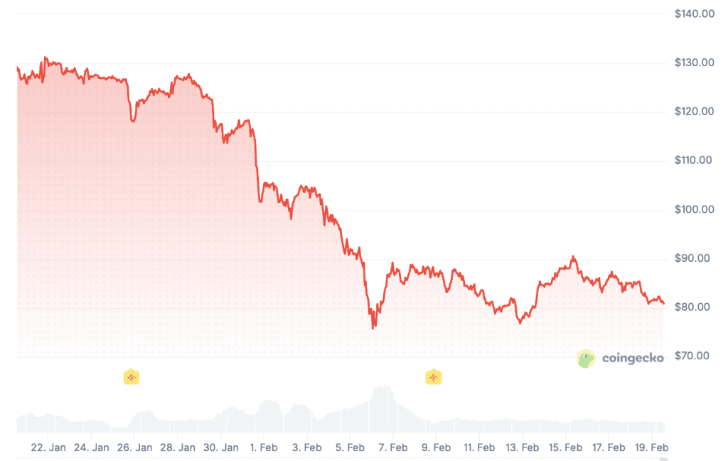 Hoewel solana een populaire cryptomunt is, heeft de koers het er maar moeilijk mee. Sinds de piek op 253 dollar in september daalde de koers met bijna 70 procent. De afgelopen maand vocht solana om het niveau rond 80 dollar te behouden, maar er zijn toenemende zorgen over dat lukt.
