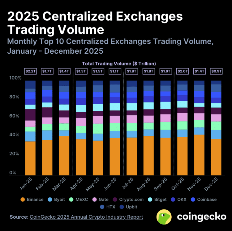 Het herstel van Bybit valt samen met een bredere toename van handel op crypto exchanges. Volgens CoinGecko stegen de handelsvolumes bij de grootste platforms in 2025 gemiddeld met ongeveer 8 procent.