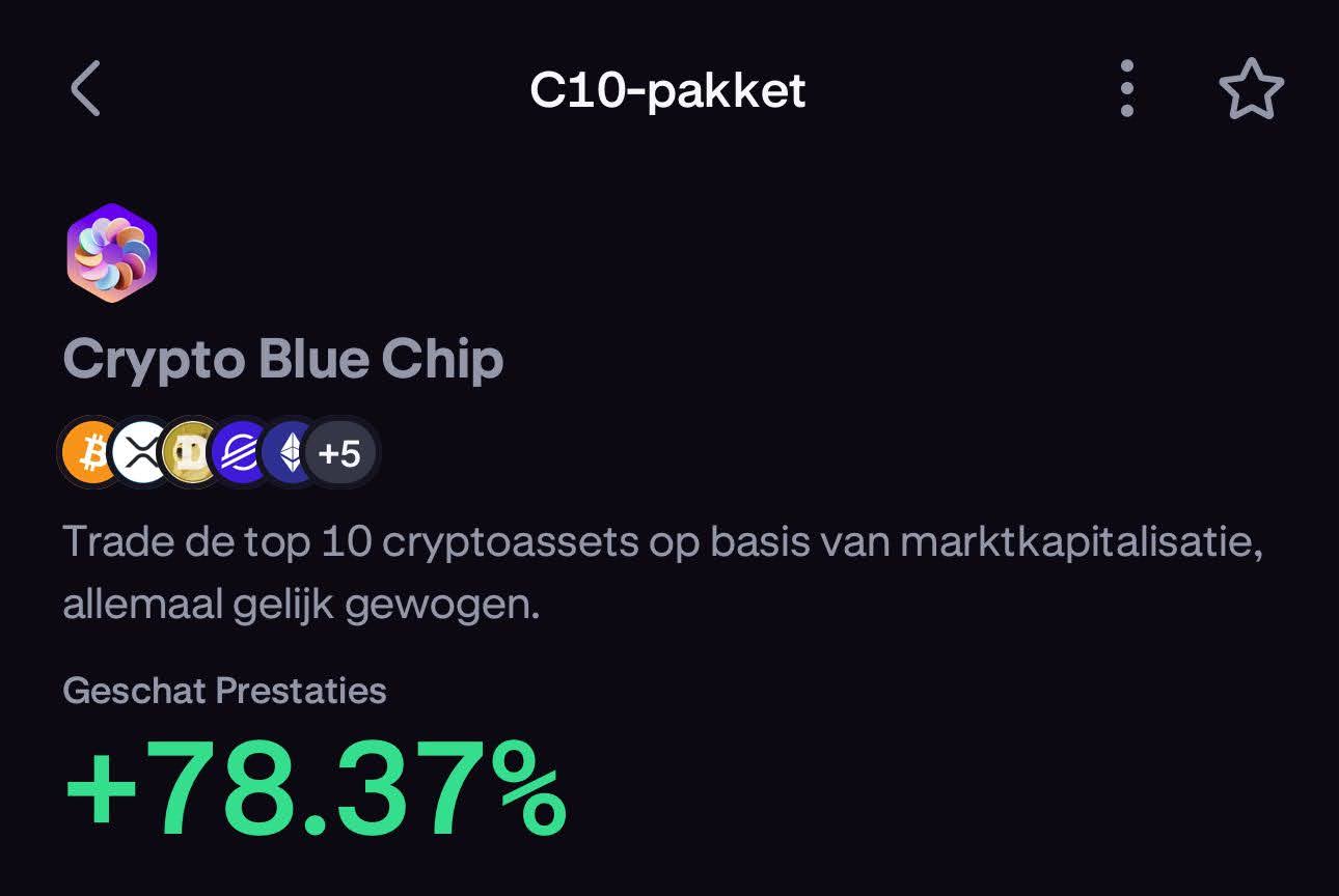 Eén van de populairste is het Crypto Blue Chip-pakket, waarin je met één klik belegt in de tien grootste en meest betrouwbare crypto’s, zoals Bitcoin, Ethereum, XRP, Solana en Cardano.